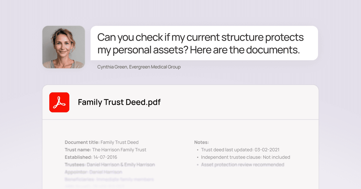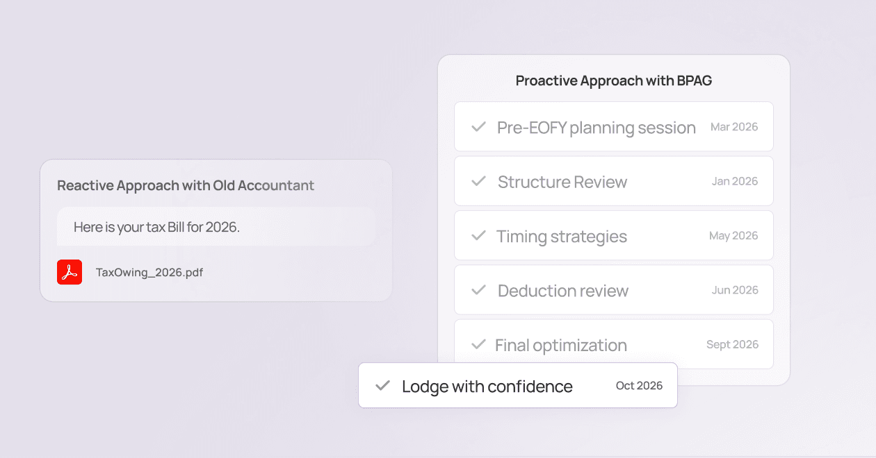 We work year-round to structure your business properly, maximise legitimate deductions, and time your income strategically—so tax time doesn't come with a nasty surprise.